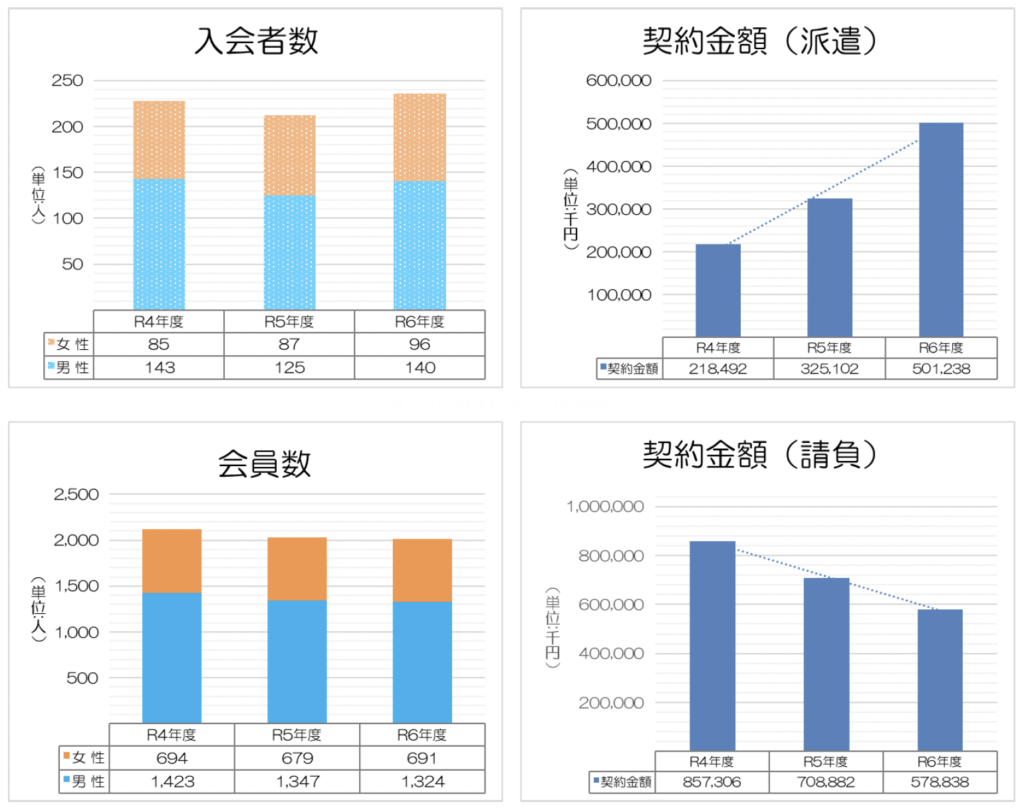 令和6年度は令和5年度と比べ会員数は横ばいですが、契約金額(請負と派遣の合計金額)は増加傾向であり、明るい兆しが見え始めました。